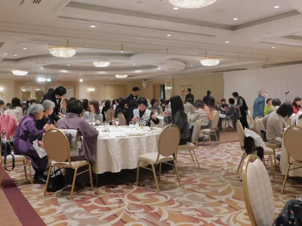 冒頭には、会長の挨拶があり、今後の予定についてのお話もありました。その後、白川様の乾杯のご発声とともに、参加者は彩りよく美味しいフランス料理のフルコースを堪能しました。ホテルのご厚意による春の日差しを感じるメニューは、年に一度の楽しみと大好評で、各テーブルでは笑顔と笑い声が絶えませんでした。
